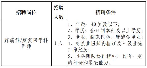 根据医院业务发展需求,现需招聘疼痛科/康复医学科编外医生1人,具体招聘条件如下: