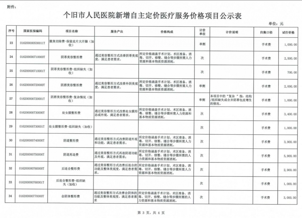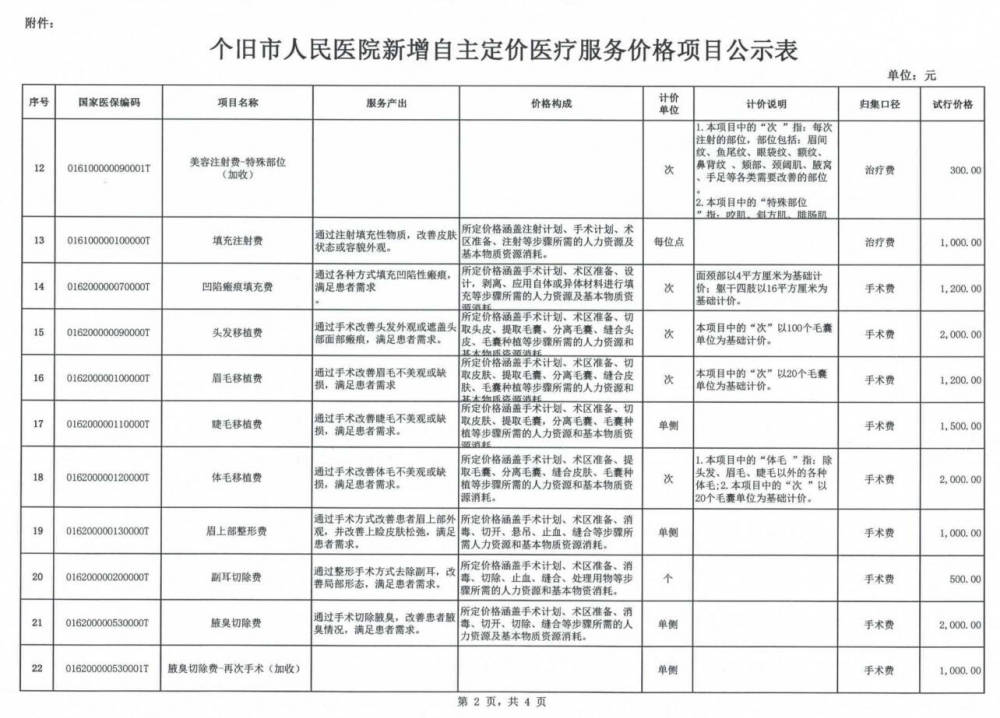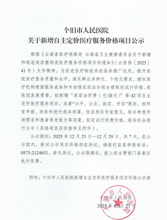 个旧市人民医院关于新增自主定价医疗服务价格项目公示